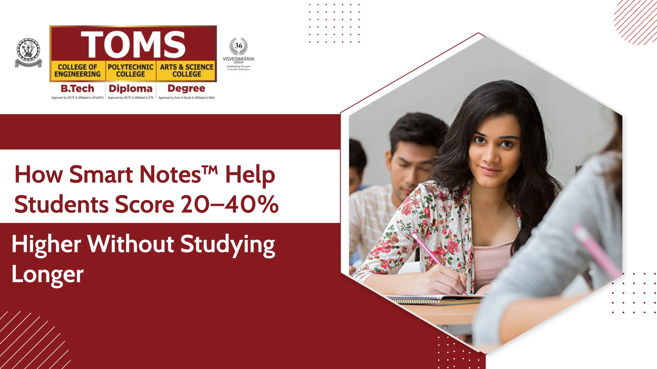 Your study habits may be perfect; however, if you still don't receive the grades that accurately depict your efforts, the system (not you) must be changed. The Smart Note™ method developed by Tom T. Joseph at TOMS College of Engineering (Kerala) focuses on the three factors common among students who consistently obtain higher than average grades from studying: 1) Memory encoding (creating a more effective method of storing information) 2) Memory retrieval (developing a more efficient way to recall information in a manner that will help you when it is most needed) 3) Answer organization (creating answers in a format that makes them easy for the examiner to read and evaluate) Students who use the Smart Note™ method regularly receive grades from 20%-40% higher than those who do not. You do not need more time; you simply need a more effective way to manage your time.