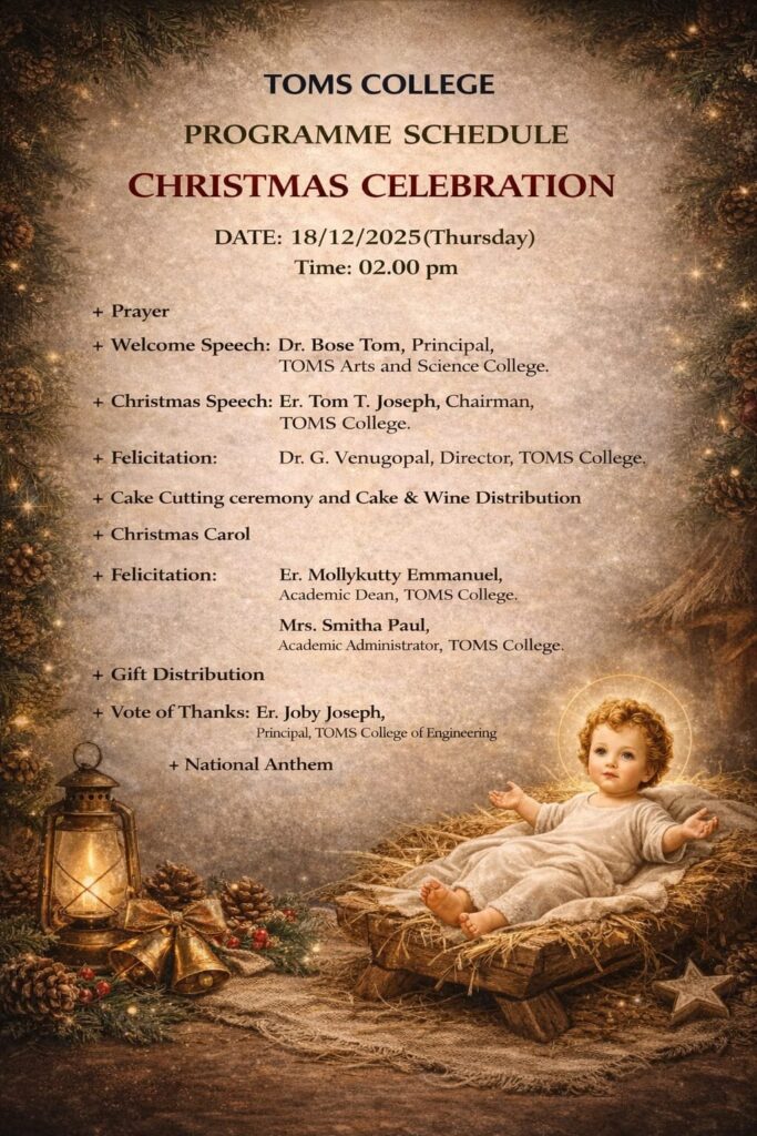 Christmas Celebration at TOMS College of Engineering and Polytechnic December 18, 2025 TOMS College of Engineering and Polytechnic celebrated Christmas with cultural programmes, carol singing, and festive activities on campus.