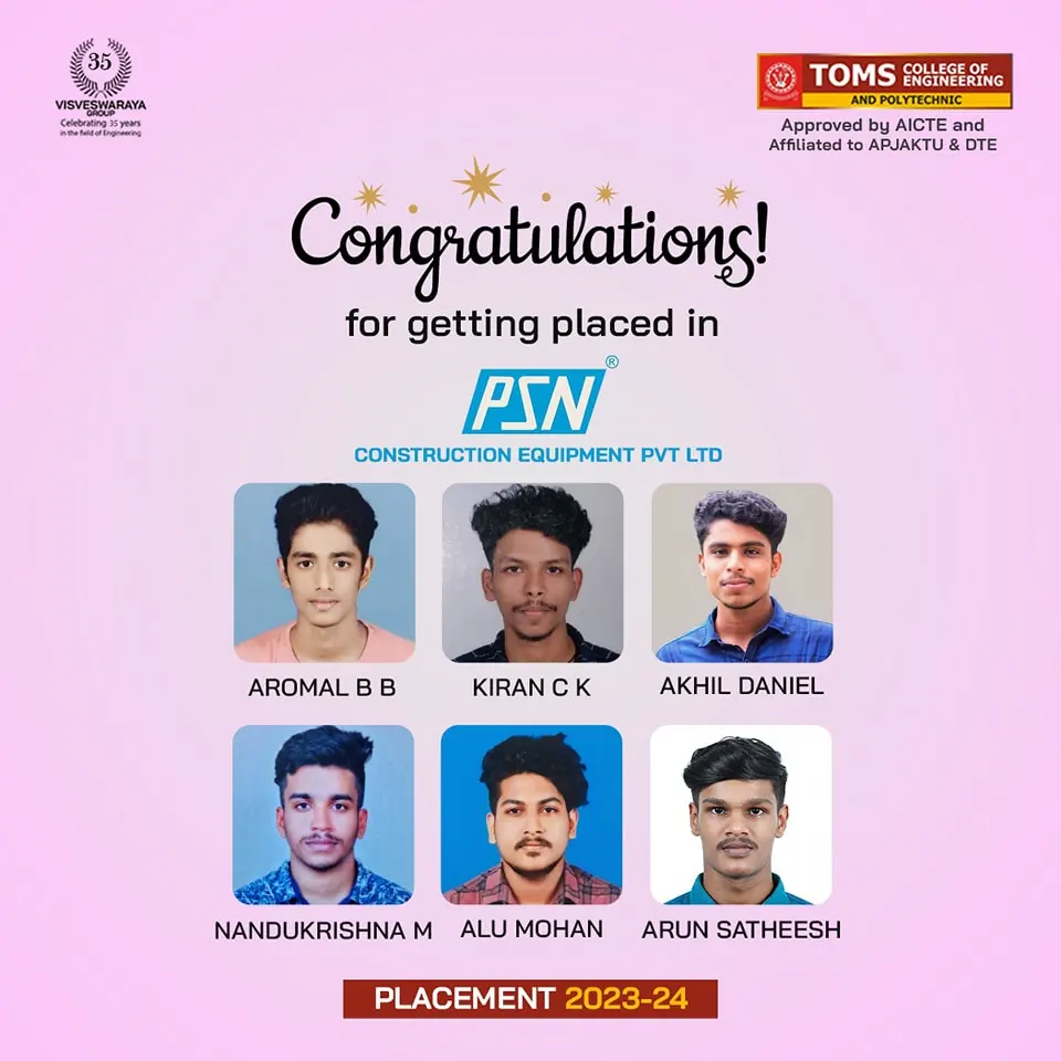 Congratulations to the students who got placement in PSN CONSTRUCTION EQUIPMENT PVT LTD from Tom's College of Engineering